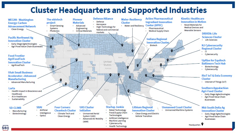 Technology clusters are defined by the U.S. Small Business Administration as “geographically concentrated groups of organizations that work together to support the growth of small businesses and their related industry.” They’ve been around since 2011, most notably as the SBA’s Regional Innovation Clusters (RICs). Now, after growing their number to 25 nationwide in 2024, the SBA’s Office of Investment and Innovation is leading an effort to better link the resources and best practices residing within them. Here’s what America’s RICs do, and how you can connect to them.